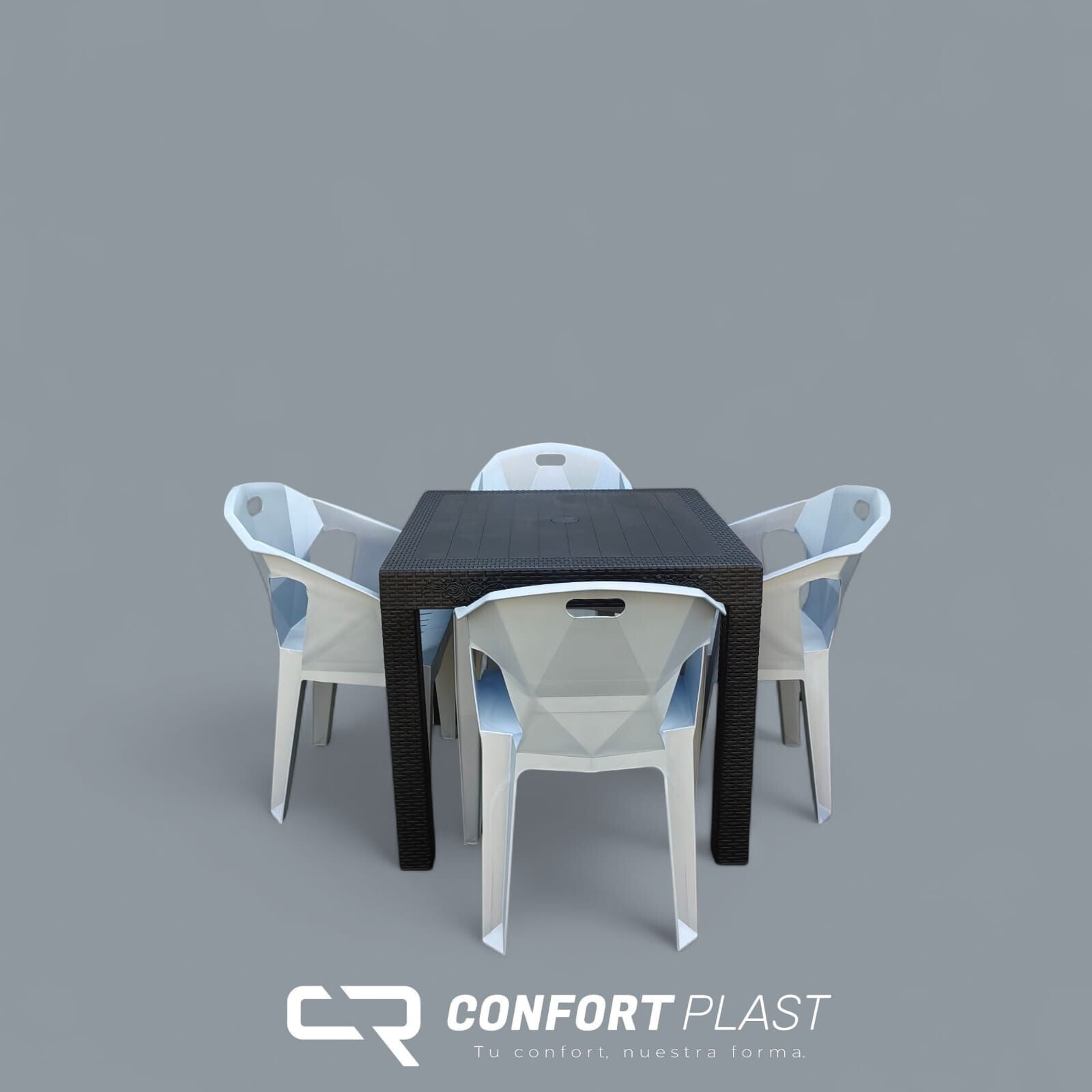 Este juego de mesa con cuatro sillas está fabricado con polipropileno de alta resistencia, ideal para uso en interiores y exteriores. Su diseño moderno, con líneas geométricas y acabado tipo rattan en la mesa, aporta estilo y funcionalidad a cualquier espacio.